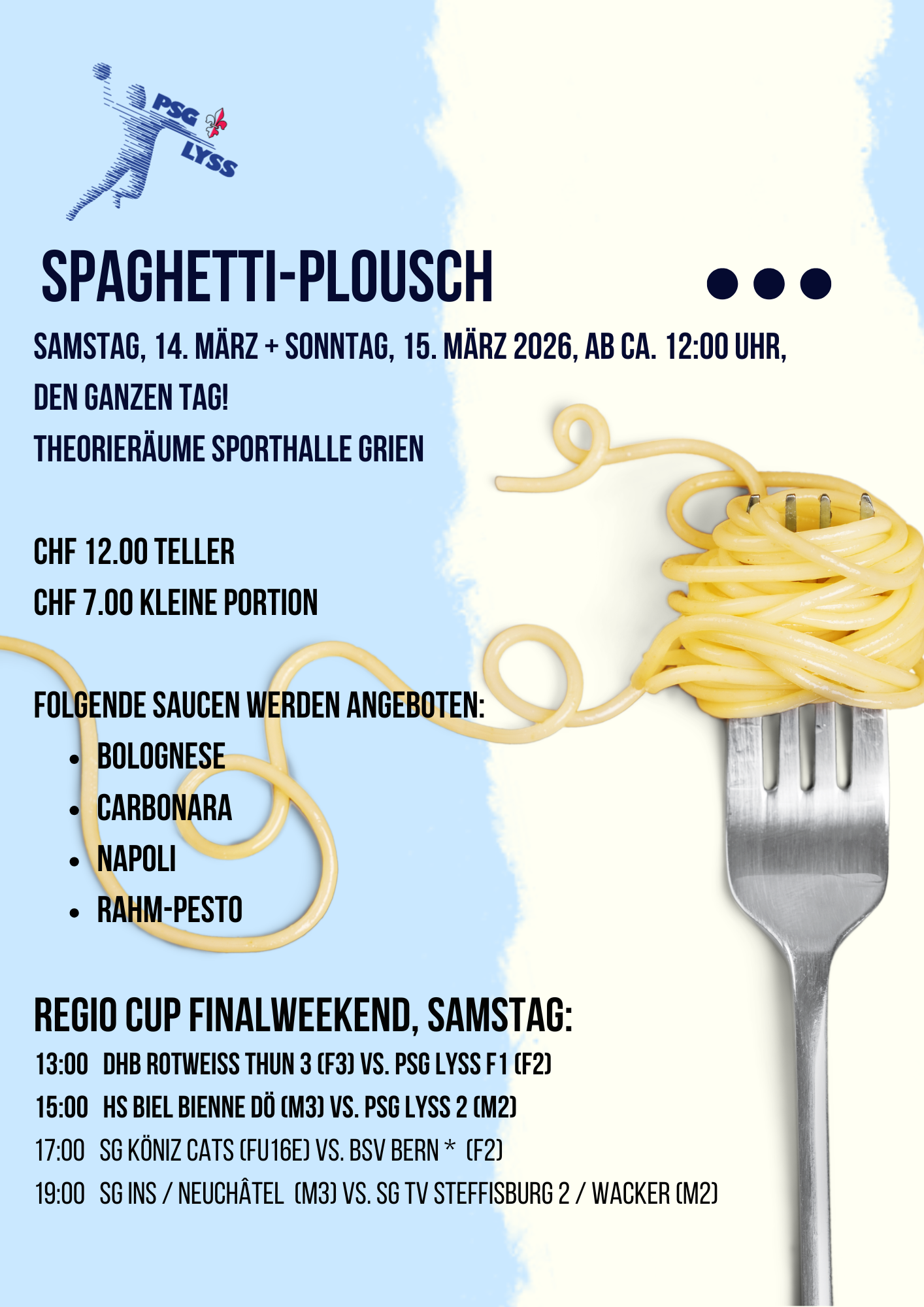 Nebst dem Regio-Cup Finalweekend findet der beliebte Spaghetti Plousch in einer etwas abgeänderten Form statt. Neugierig? Dann komm vorbei!